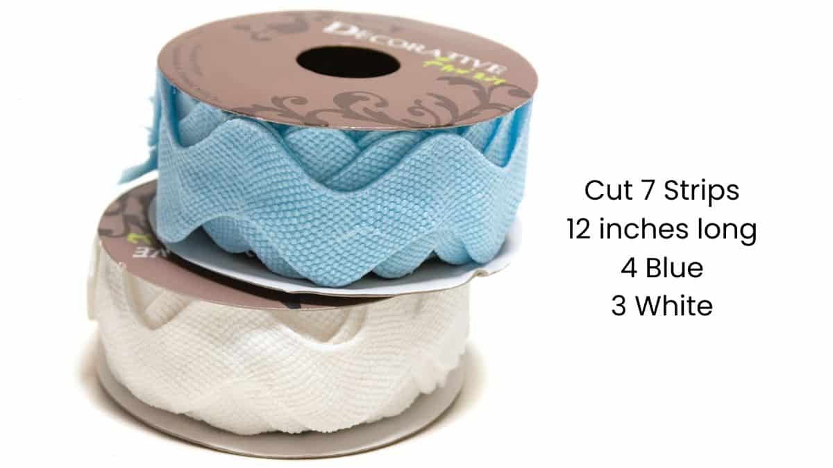 Cut the trim ribbon into 12-inch pieces. 4 blue and 3 white.