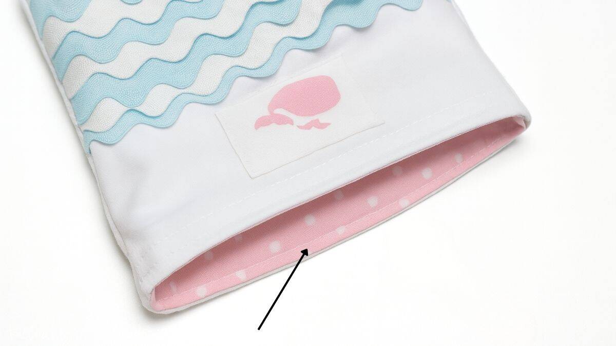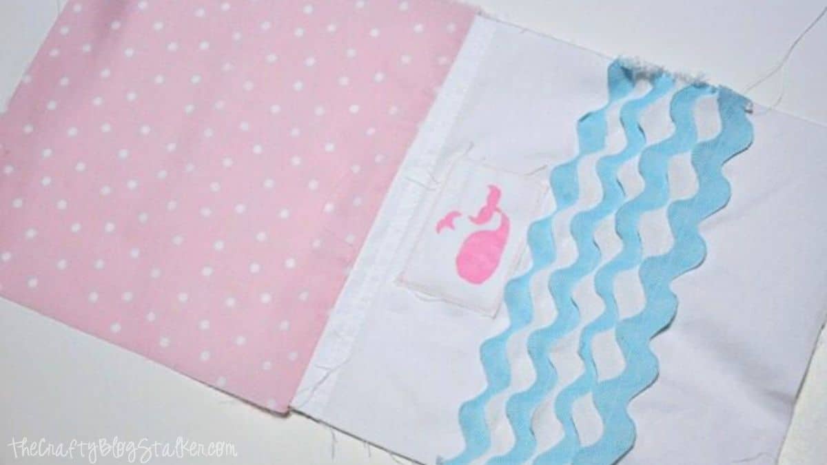 After the ric rac is positioned, stitch it in place, beginning with the top piece (the one directly beneath your whale tag).